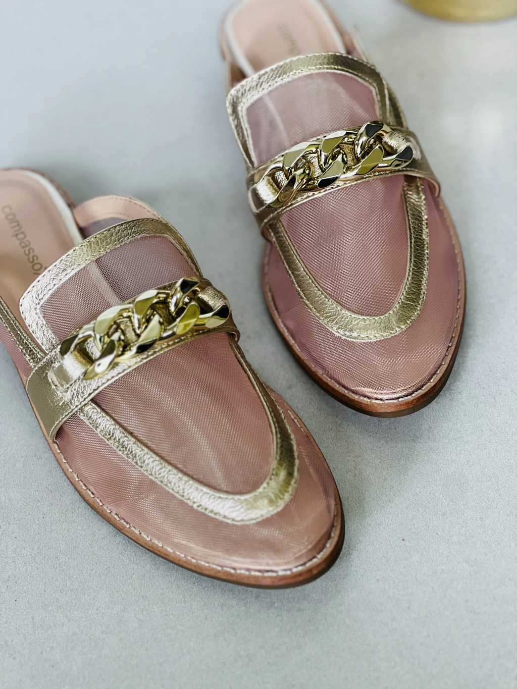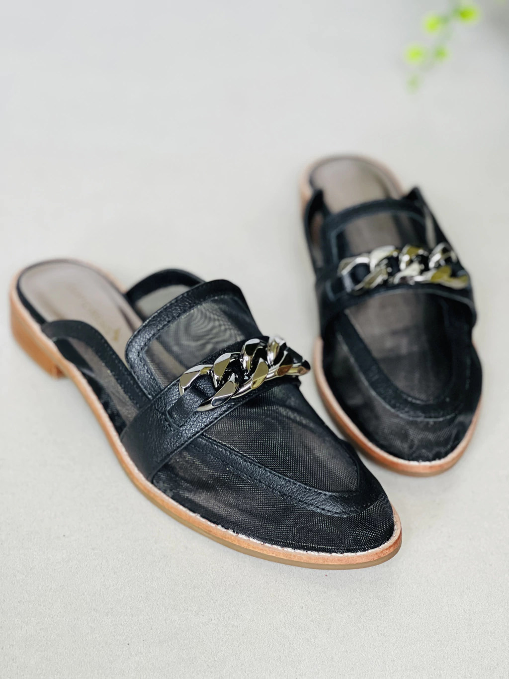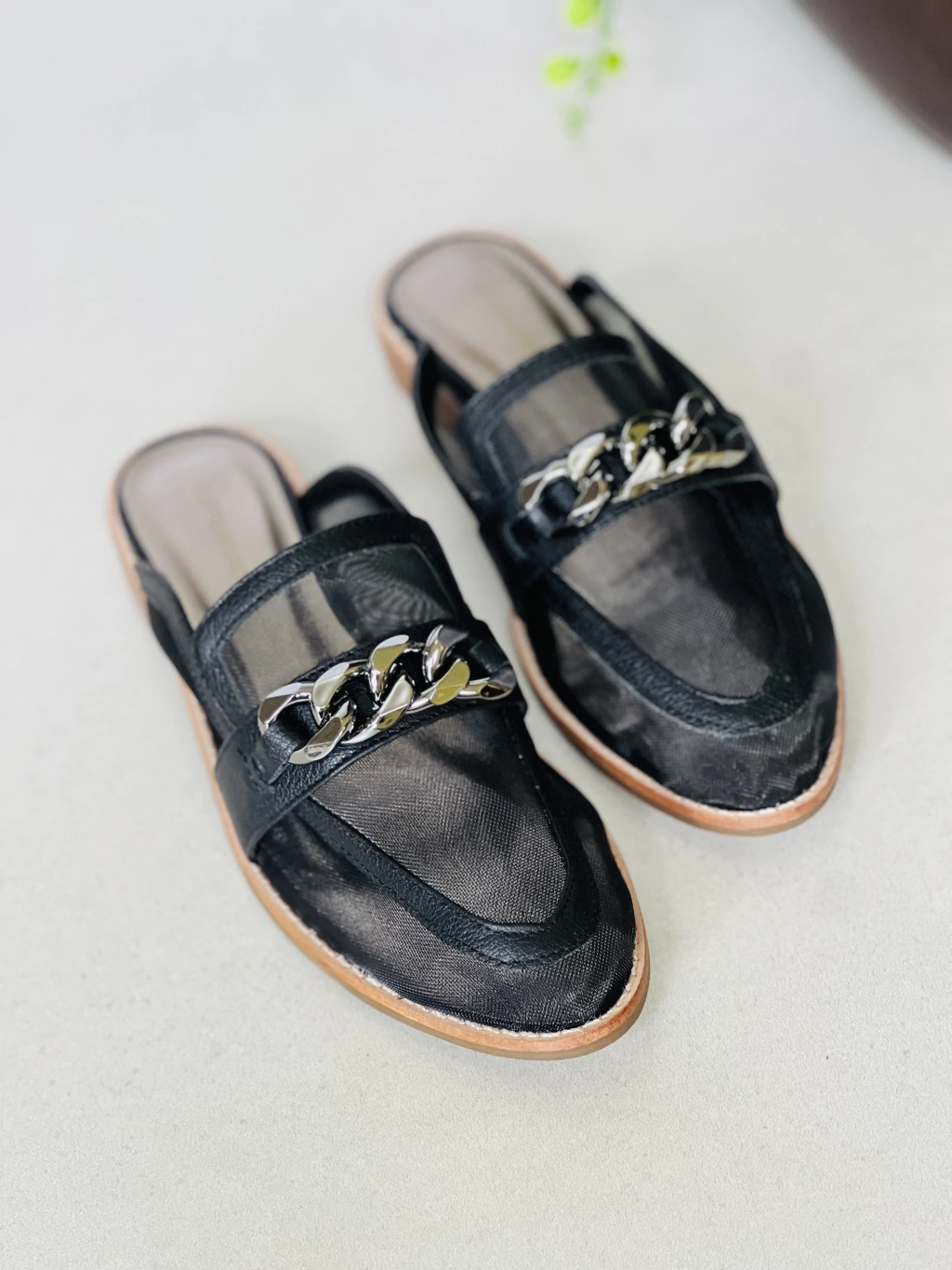Descubra o charme do Mule Feminino em Couro e Tela, com detalhe em correntaria que adiciona um toque único de sofisticação. Seu salto Fachete baixo garante conforto para o dia a dia, perfeito para quem não abre mão do estilo aliado à praticidade. Ideal para compor looks elegantes e modernos com facilidade.