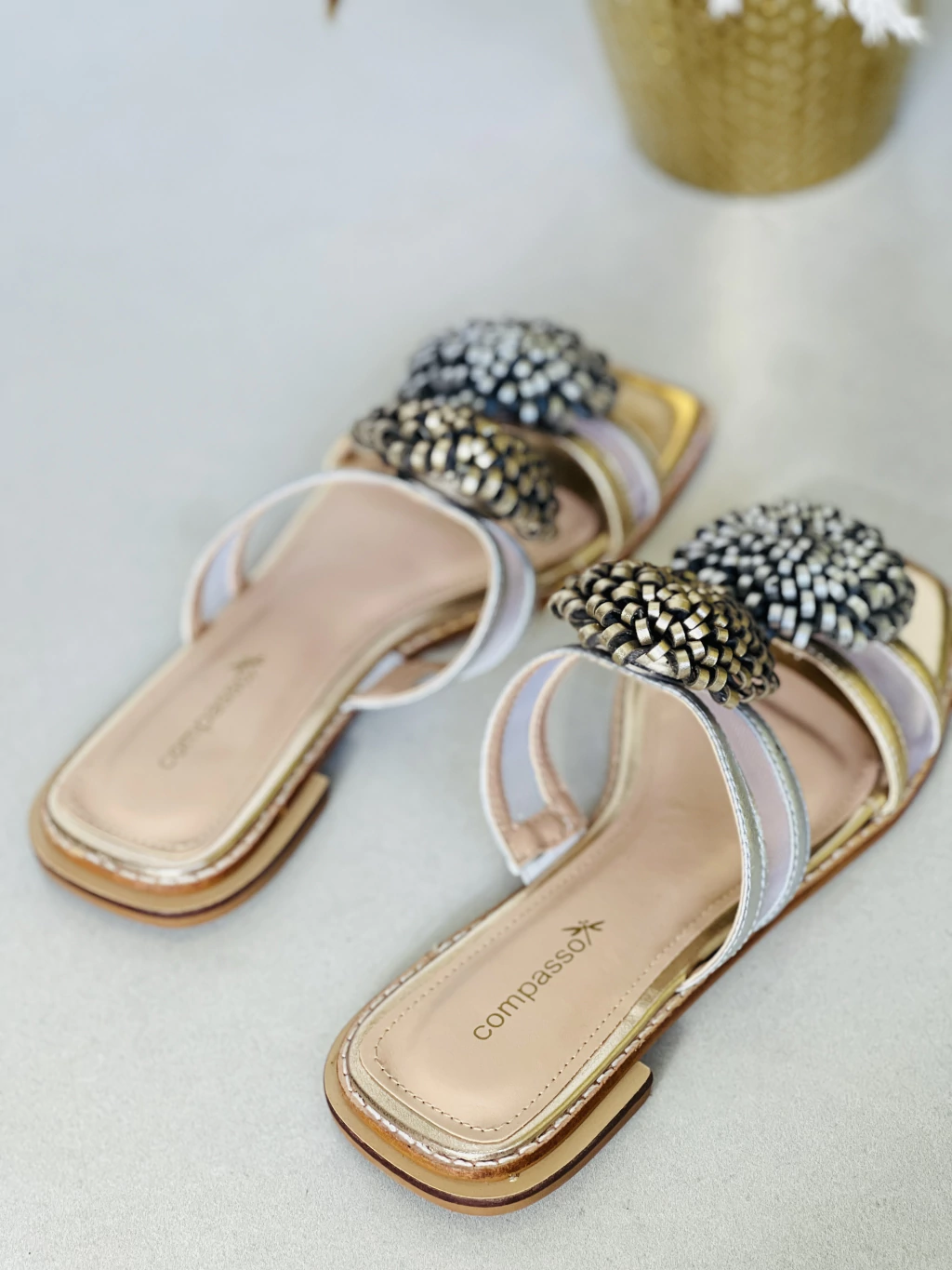 Rasteira Feminina Couro e Tela Metalizada com Pom Pom: charme e conforto em cada passo!