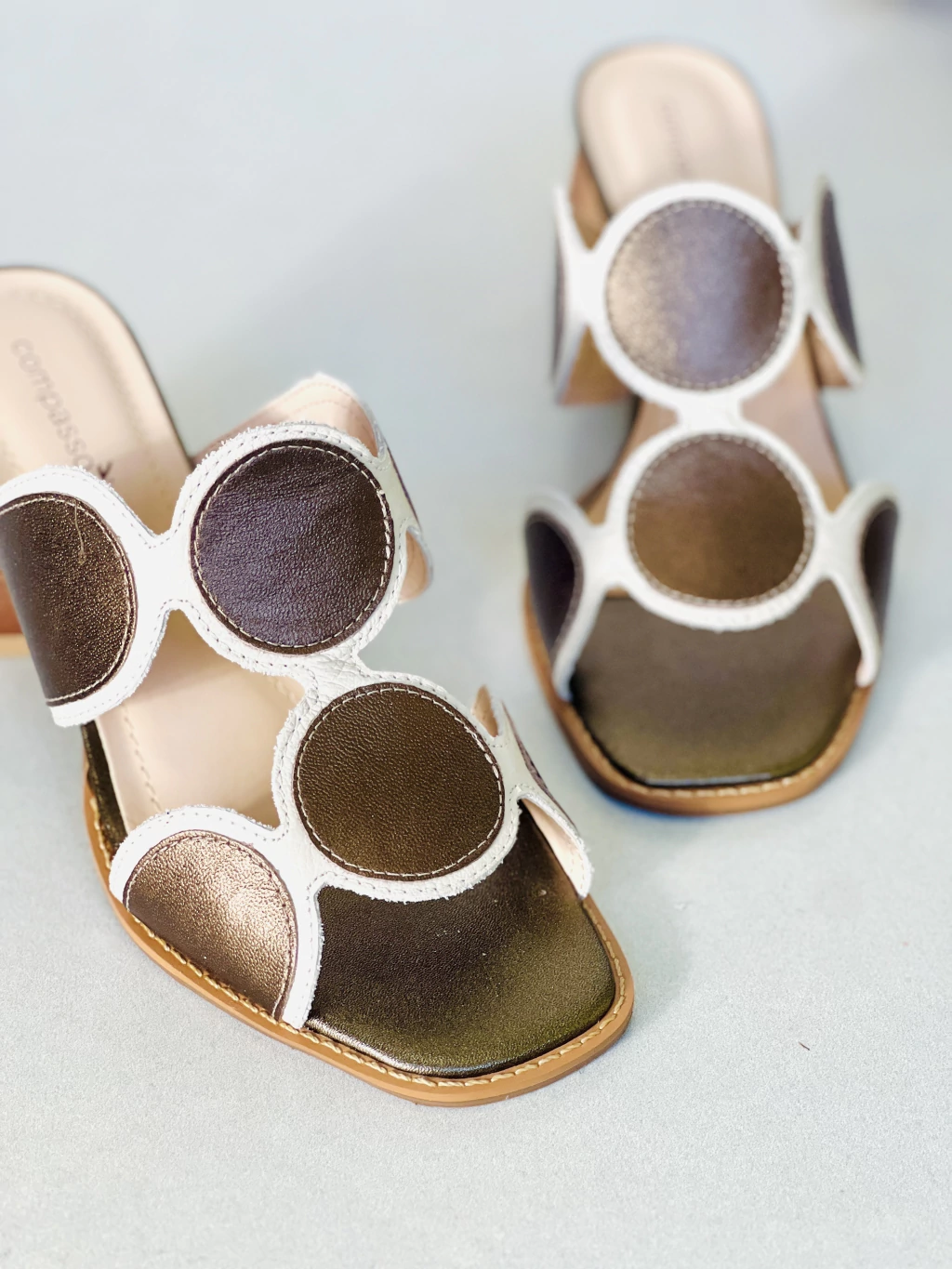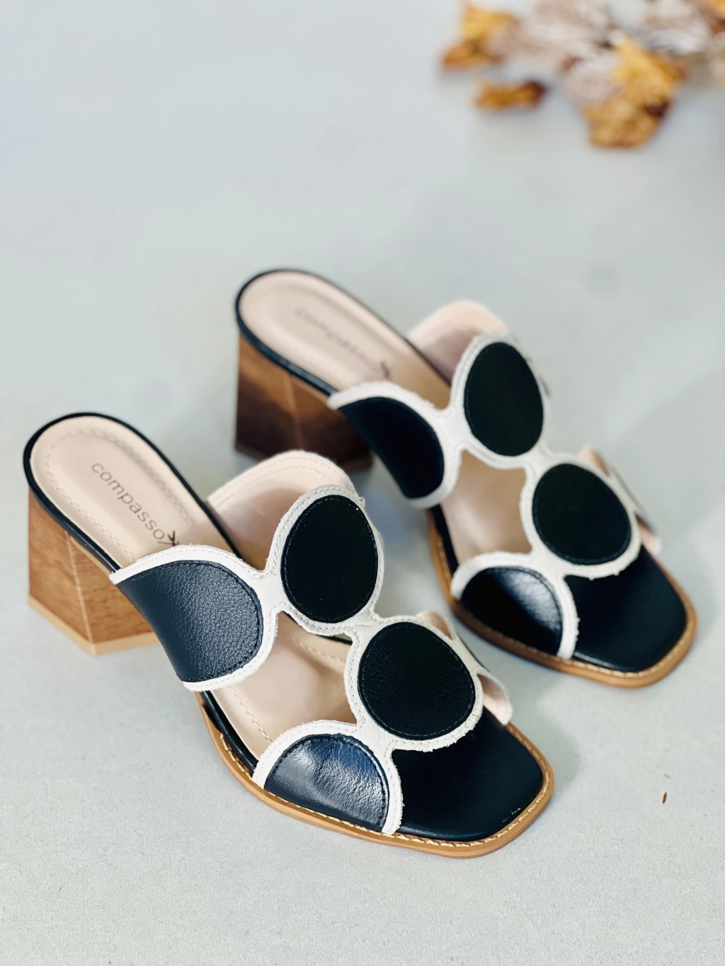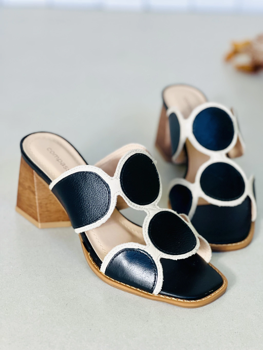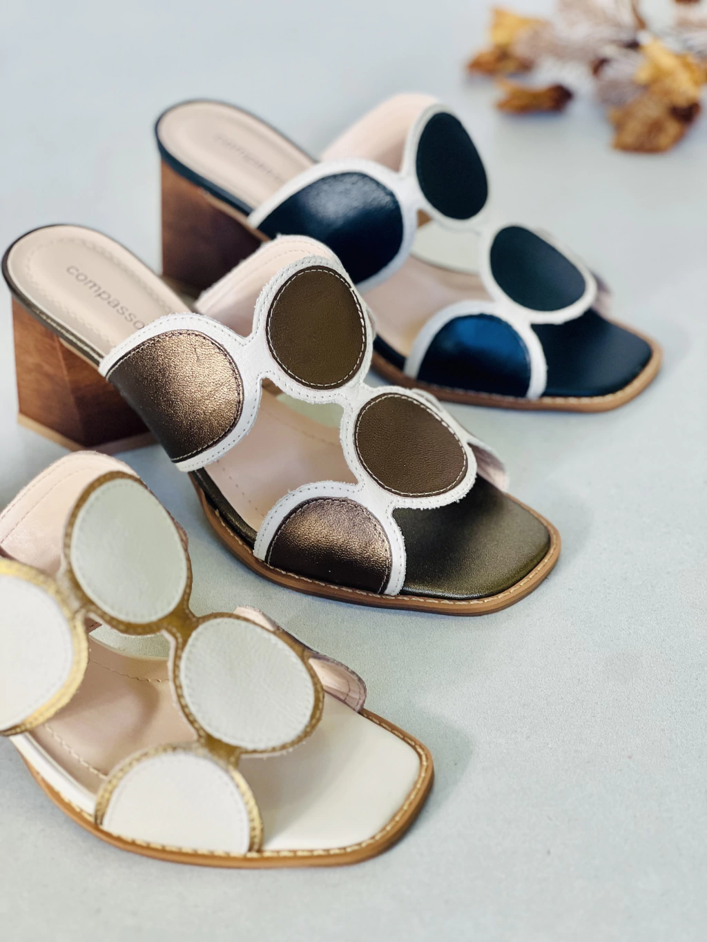 Tamanco Couro com Cabedal em Designer de Círculos - Salto Médio Fachete